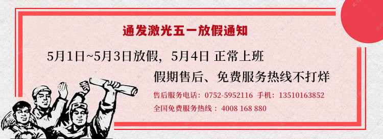 假期預(yù)告:通發(fā)激光自2022年5月1日起至5月3日放假三天,期間售后服務(wù)、全國免費服務(wù)熱線暢通,持續(xù)為大家提供有力的設(shè)備使用保障!