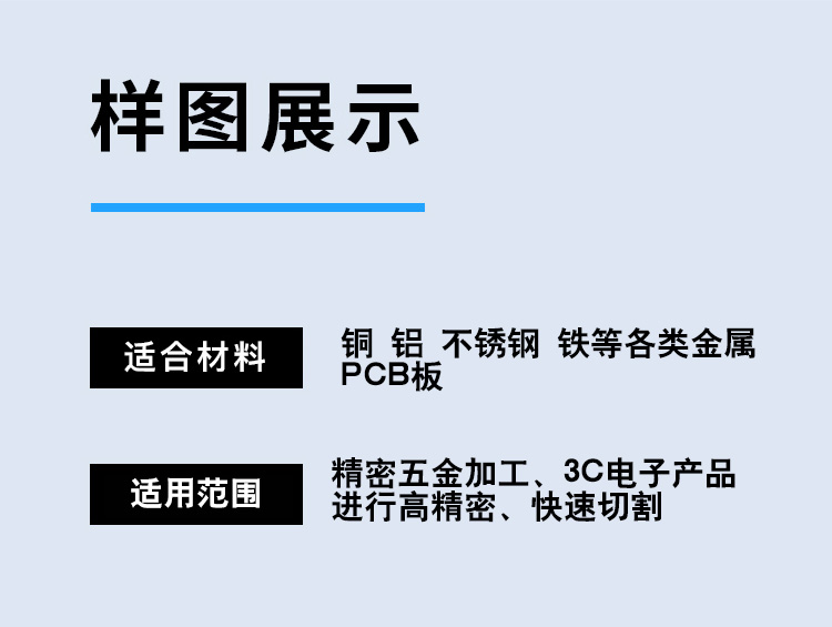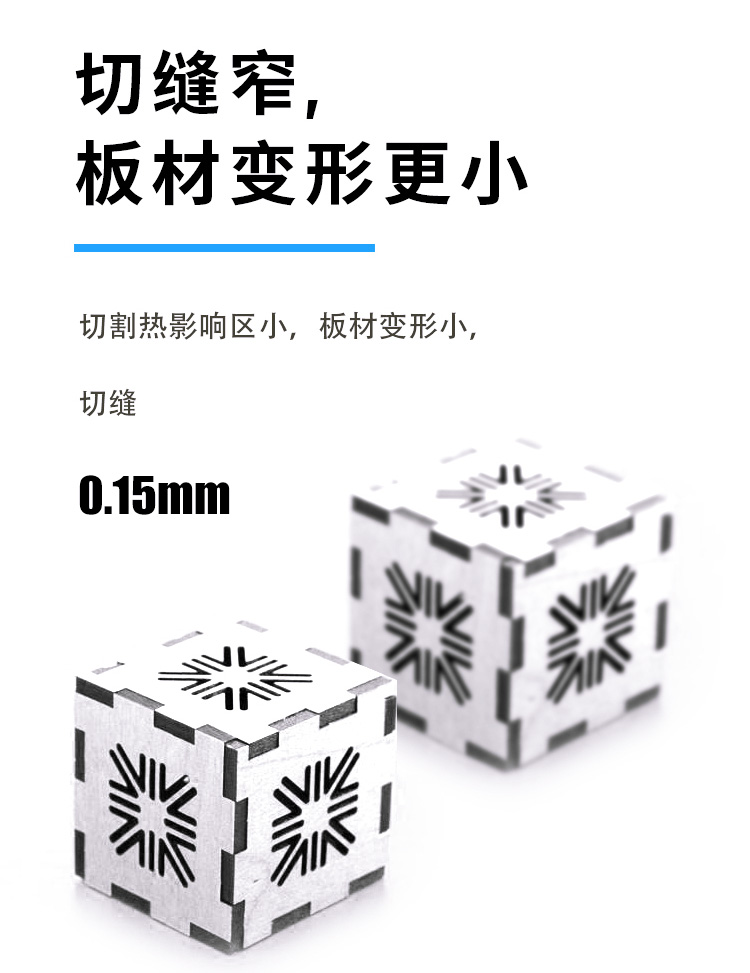 適用范圍廣,可加工銅、鋁、不銹鋼、鐵、pcb板、磁性材料等多鐘材料。幅面大小可選,長度可根據(jù)用戶加工需求定制。切割速度快,效果光滑平整,切口沒有機(jī)械應(yīng)力,光滑平整無剪切毛刺。